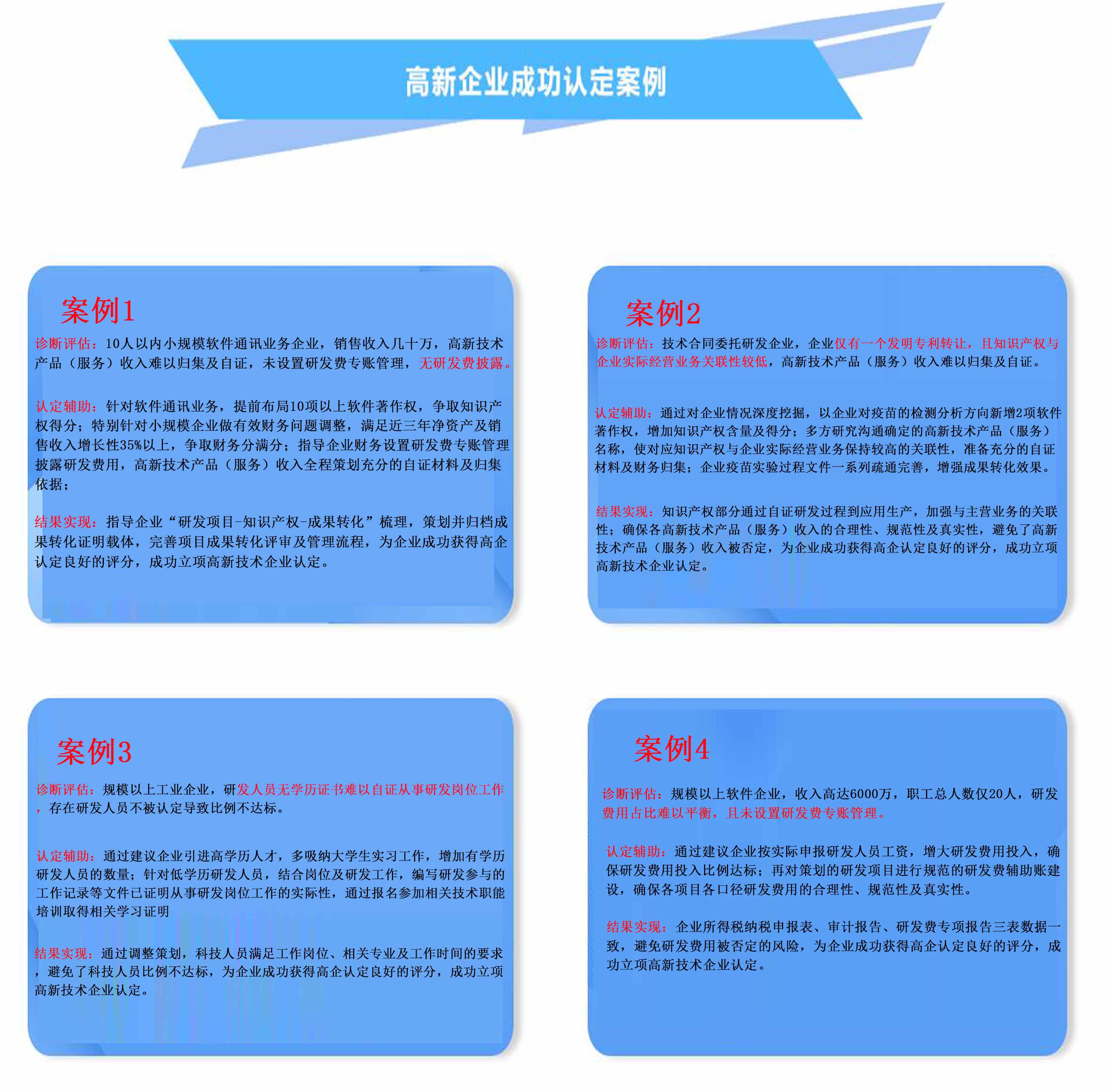 認(rèn)定輔助:針對(duì)軟件通訊業(yè)務(wù),提前布局10項(xiàng)以上軟件著作權(quán),爭(zhēng)取知識(shí)產(chǎn)權(quán)得分;特別針對(duì)小規(guī)模企業(yè)做有效財(cái)務(wù)問題調(diào)整,滿足近三年凈資產(chǎn)及銷售收入增長(zhǎng)性35%以上,爭(zhēng)取財(cái)務(wù)分滿分;指導(dǎo)企業(yè)財(cái)務(wù)設(shè)置研發(fā)費(fèi)專賬管理披露研發(fā)費(fèi)用,高新技術(shù)產(chǎn)品(服務(wù))收入全程策劃充分的自證材料及歸集依據(jù);